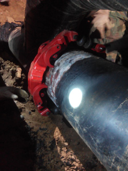 當(dāng)晚,從晚上18點開挖作業(yè)坑,由煤氣公司管線所負責(zé)人籍所長現(xiàn)場指導(dǎo)工作,直至凌晨一點,閥井全部挖開。客戶采用雙向供氣模式,臨時關(guān)閉需更換閥門兩端的閥門,打開放散空放散管道余氣,去除陳舊閥門螺帽和螺栓,處理管道表面PE防腐層,切割前準(zhǔn)備工作做好后,搶險隊同志們按照步驟安裝我司旋轉(zhuǎn)式切管機ECR12,進刀、旋轉(zhuǎn)、不停進刀,不到二十分鐘時間把DN300鋼管順利切斷,整個切割過程實現(xiàn)了無火花,斷口筆直、無碎屑,更省力,使切開后的管道余氣自然排放,避免了動火切割帶來的潛在危險。 隨后,搶維修隊的隊員們按照計劃更換閥門,直至凌晨六點鐘搶維修工作才圓滿結(jié)束。事后,晉中煤氣公司管線所長及搶維修隊對我司管道冷切割工具給予很高評價,同時,能為幫助客戶解決問題,我們感到尤為的榮幸,這標(biāo)志著我司產(chǎn)品質(zhì)量受到客戶的認可與肯定!