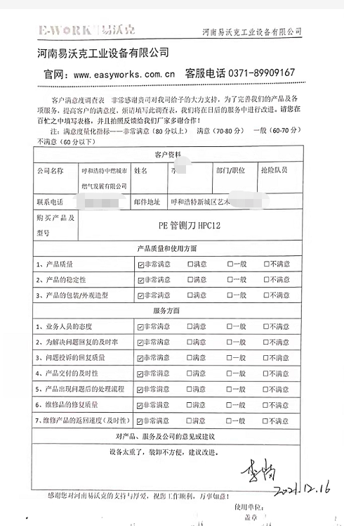 當(dāng)月呼和浩特中燃公司收到易沃克PE管鍘刀后立即開始現(xiàn)場燃?xì)釶E管切割搶修現(xiàn)場,現(xiàn)場工人師傅反饋使用后贊不絕口,這個易沃克廠家的PE管鍘刀質(zhì)量和效率真不錯,十多分鐘就可以帶氣切割大大提供現(xiàn)場搶修PE管切割時間,而且燃?xì)夤艿缼釶E管切割操作,現(xiàn)場師傅說前幾年一直用的美國進(jìn)口PE管鍘刀,想不到我們國產(chǎn)易沃克PE管鍘刀效果這樣好我們易沃克廠家的售后服務(wù)團(tuán)隊跟蹤一直在跟進(jìn)使用效果以及現(xiàn)場視頻免費(fèi)技術(shù)指導(dǎo),下面是燃?xì)夤艿垃F(xiàn)場PE管鍘刀使用效果反饋圖 和售后的服務(wù)評價表